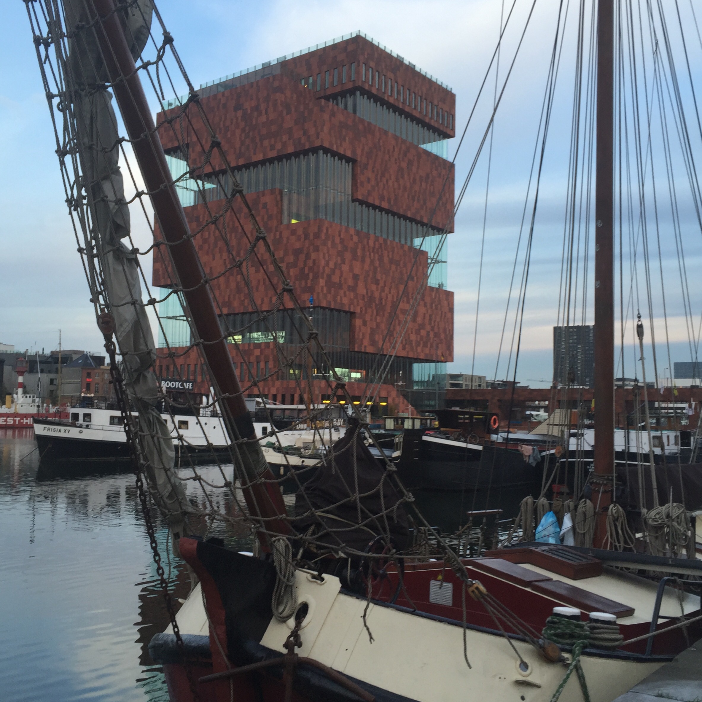 Dass Antwerpen eine Hafenstadt ist, spürt man als Tourist nicht unbedingt. Wir sind mit der Straßenbahn zum Hafen gefahren, um das zeitgenössische Museum MAS zu besuchen. Das imposante Gebäude erlaubt dann einen tollen Ausblick von 9. Stock aus und bietet in jedem Stock eine andere Perspektive auf den Hafen. Es wurde unter anderem dort gebaut, um den Hafen wieder etwas attraktiver zu machen, da er von der Stadt selbst auch nicht so stark im eigenen Marketing hervorgehoben wird.