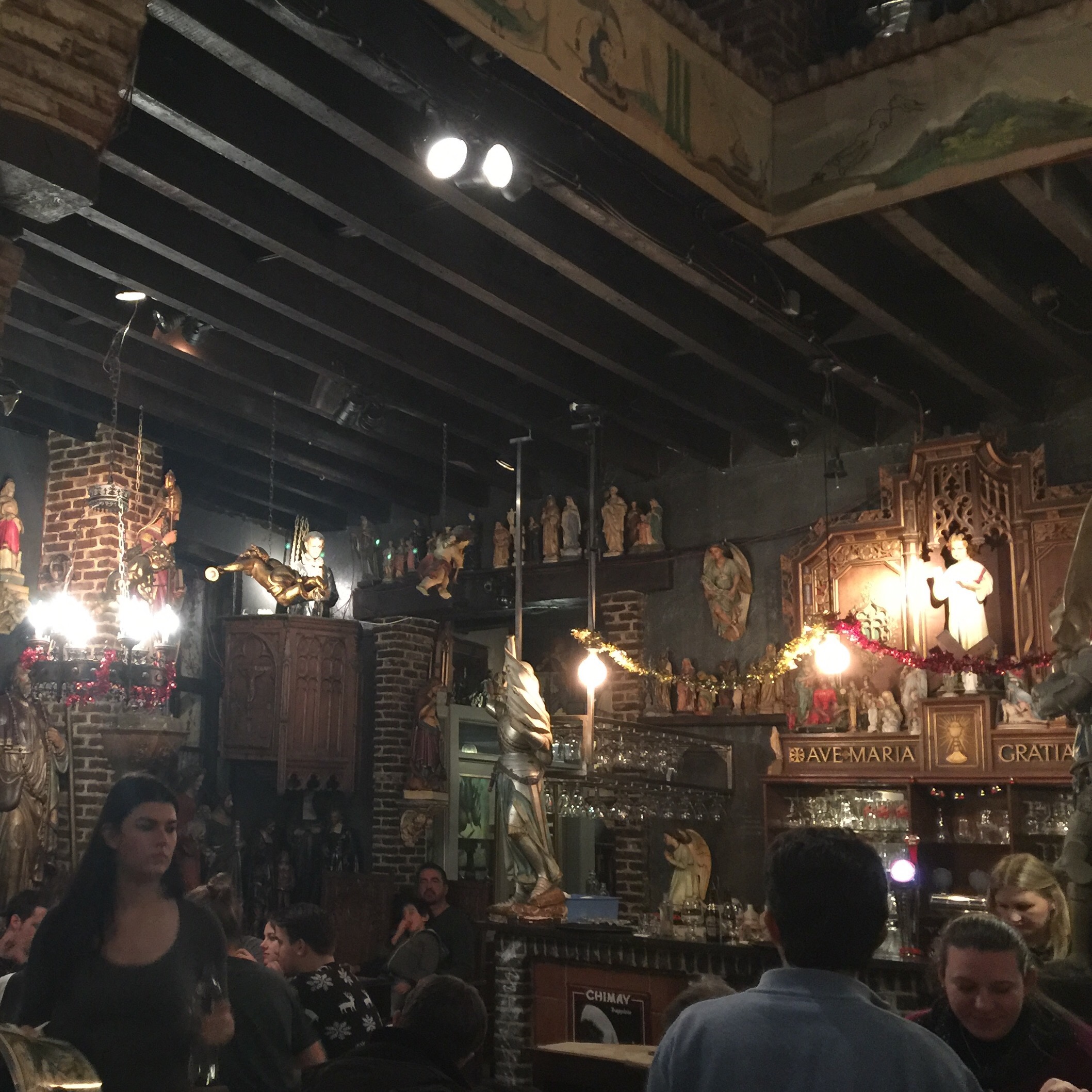 Jeder Tag kann in Sachen Kulinarik einer anderen Kultur gewidmet werden. So haben wir am ersten Tag Libanesisch gespeist, waren zwei Mal in typischen belgischen Restaurants, aber auch Pizza Hut durfte uns zu ihren Gästen zählen. Sehr zahlreich sind auch die Restaurants, die vegetarische und vegane Gerichte anbieten. So waren wir hier im „Green Way“ und im „Lombardia“, zwei Restaurants, die nicht nur mit ihrer Küche überzeugten, sondern auch mit ihrer Einrichtung. Die belgischen Restaurants, die wir besucht haben, waren „De Groote Witte Arend“ und „Het Elfde Gebod“ (das 11. Gebot). Letzteres punktete mit einer wirklich außergewöhnlichen Atmosphäre. Hier speisen die Gäste neben 487 Heiligenstatuen, die von der Kirche oder Privatpersonen gespendet wurden. Einige von uns fühlten sich allerdings ein bisschen beobachtet.